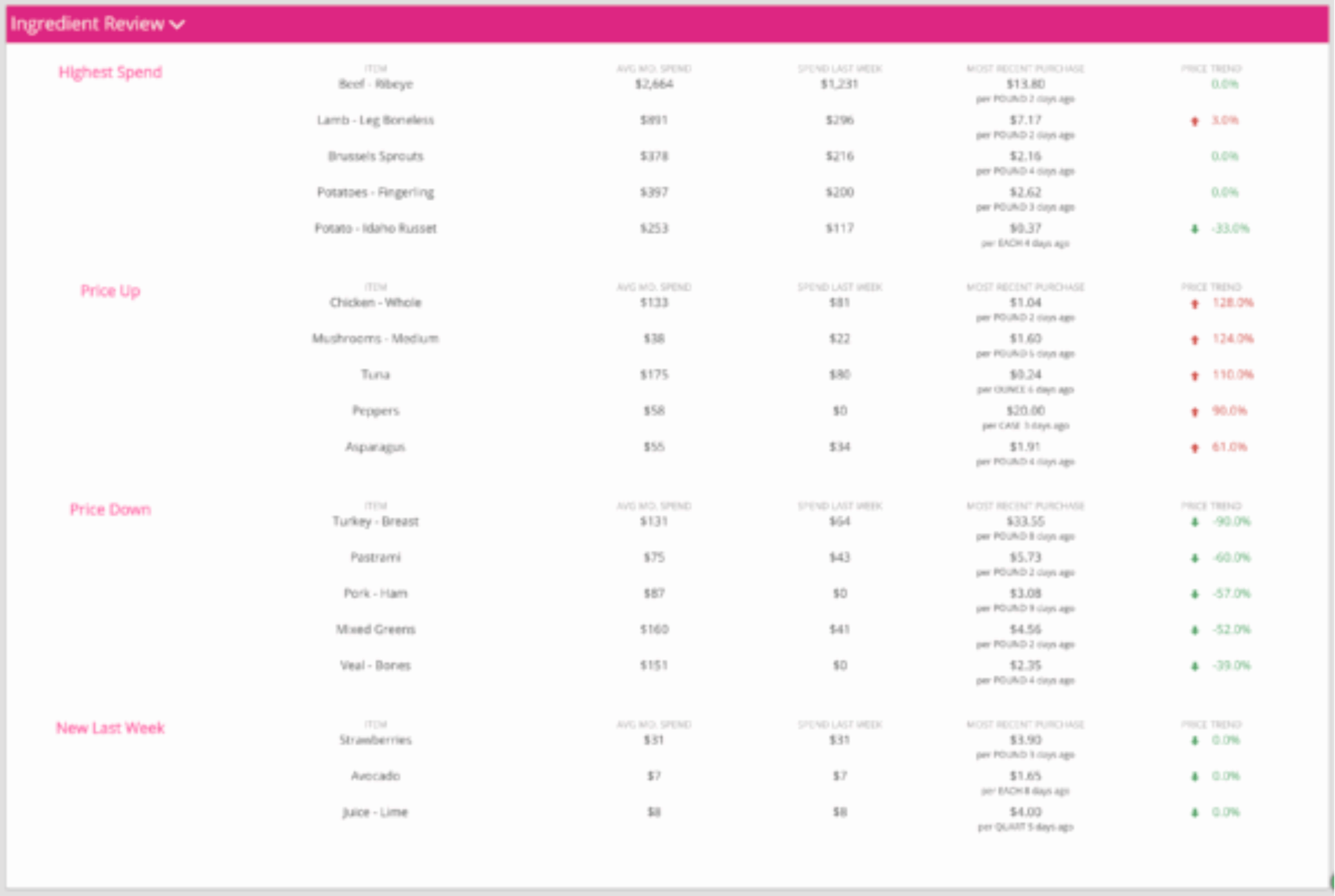 Now you’ll know your average weekly spend, last week’s spend, your most recent purchase price, and the current pricing trend (up or down).