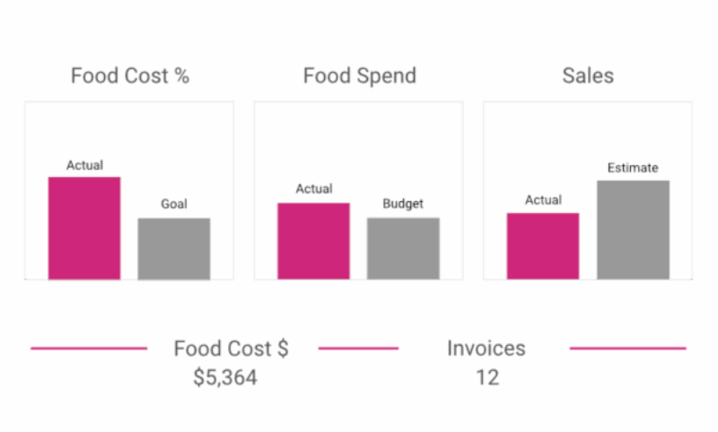 Quickly review food cost, food spend, and sales at the top of each week’s staff review. See how your actual food cost (cost of goods sold) compares to your goal. Each week you’ll be able to see:
